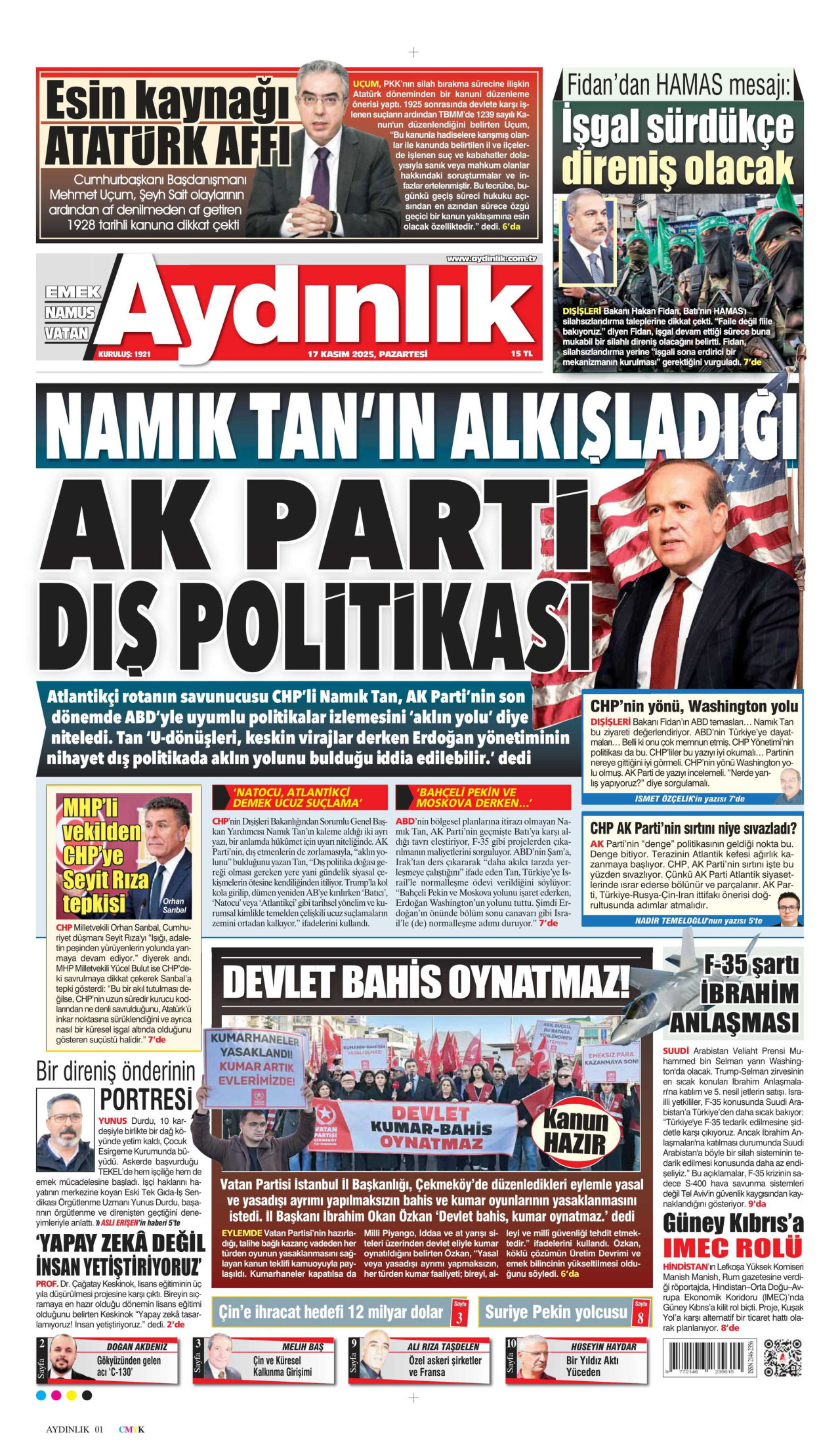 AYDINLIK GAZETESİ Gazetesi 17 Kasım 2025, Pazartesi Günü Manşeti